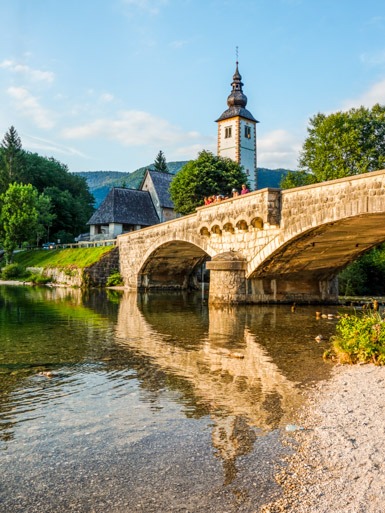 Von Bled kommend erreichst Du nach etwa 35 Minuten den kleinen Touristenort Ribčev Laz, direkt am Ostufer des Bohinj-Sees. Ein beliebtes Fotomotiv im Ort ist das Kirchlein Janez Krsnik, das Du über eine steinerne Brücke erreichst. Von dort kannst Du auch den höchsten Bergs Sloweniens sehen, den Triglav.
