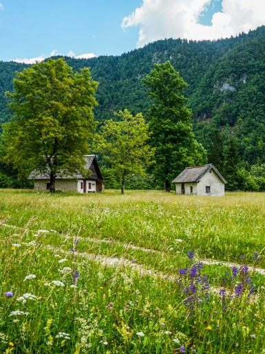 An dieser Stelle kannst Du vorzeitig umkehren, oder (absolute Empfehlung!) noch eine Stunde über die Almwiesen des schönen Voje-Tals zum 21 Meter hohen Mostnica Wasserfall weiterwandern. In der Okrepčevalnica Slap Voje, einer urigen Hütte mit schöner Terrasse und guter Küche, kannst Du dann den Rest des Tages wunderbar entspannen, lesen, Dich sonnen oder Kuchen schlemmen.